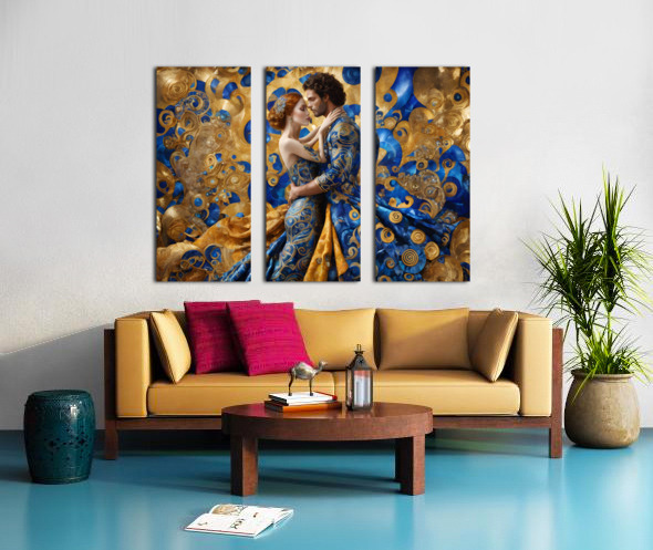 A (((Gustav Klimt-inspired husband and wife embrace))), with intricate details and flowing locks mirroring the artist's style, dressed in elaborate patterns reflective of his style, poised confidently within a (vibrant kaleidoscope of love) where a baby nested safely among them, its tiny form complemented by a powerful blue whirlpool backdrop (Copyright ISHISH 2024 All rights Reserved)