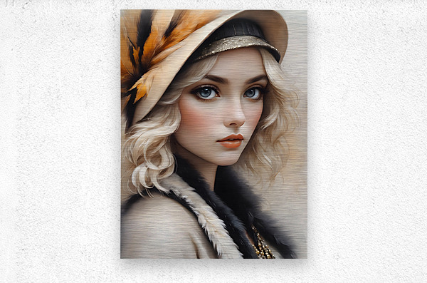 Agatha Moreira's face, capturing big eyes with a gouache wash technique, in a style reminiscent of Rolf Armstrong, Paul Poiret, and Margaret Keane, full body portrait incorporating a mix of darkness and mystery with a seductive, modern vintage allure akin to a 'Great Gatsby' autumn fashion ensemble, fur stole, captivating with a hypnotic look, styled with blonde, wavy hair (Copyright ISHISH 2024 All rights Reserved)