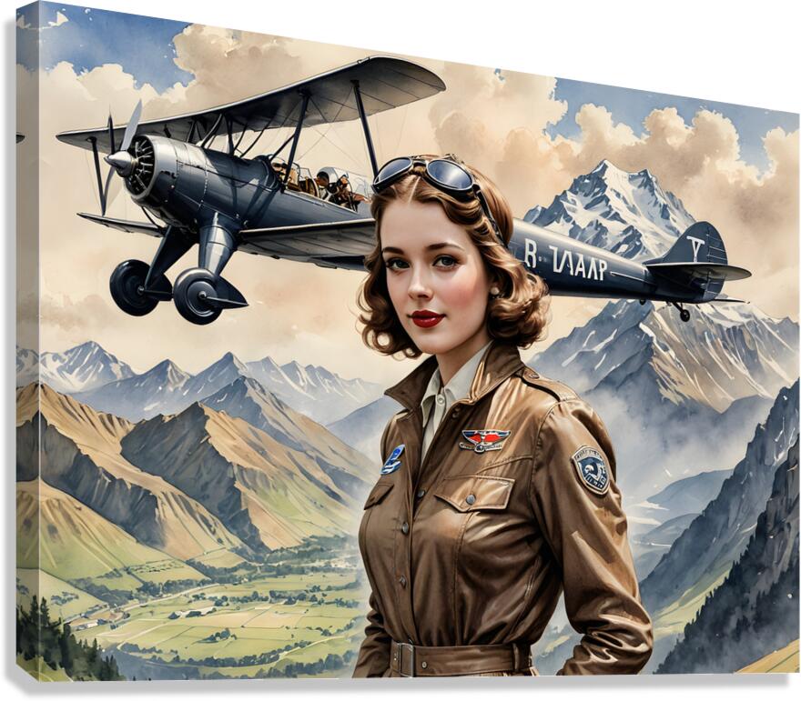 A charcoal drawing of the beautiful Amelia Airheart, the most gorgeous aviator in the 1930s, with her aviator clothes posing against a backdrop of a majestic mountain range, its sleek biplane effortlessly soaring above a verdant valley. The drawing captures the essence of adventure and glamour, blending the classic elegance of yesteryear's golden age with the freedom of a bygone era.) The image exudes a timeless allure, inviting viewers to take a trip through the skies of this captivating and breathtaking world. (Copyright ISHISH 2025 All rights Reserved)