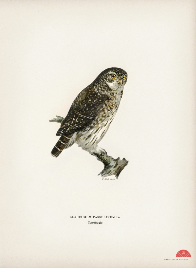 Glaucidium passerinum illustrated by Magnus von Wright 1905-1968. from 1929 folio version of Svenska Fåglar Efter Naturen Och Pa Sten Ritade.