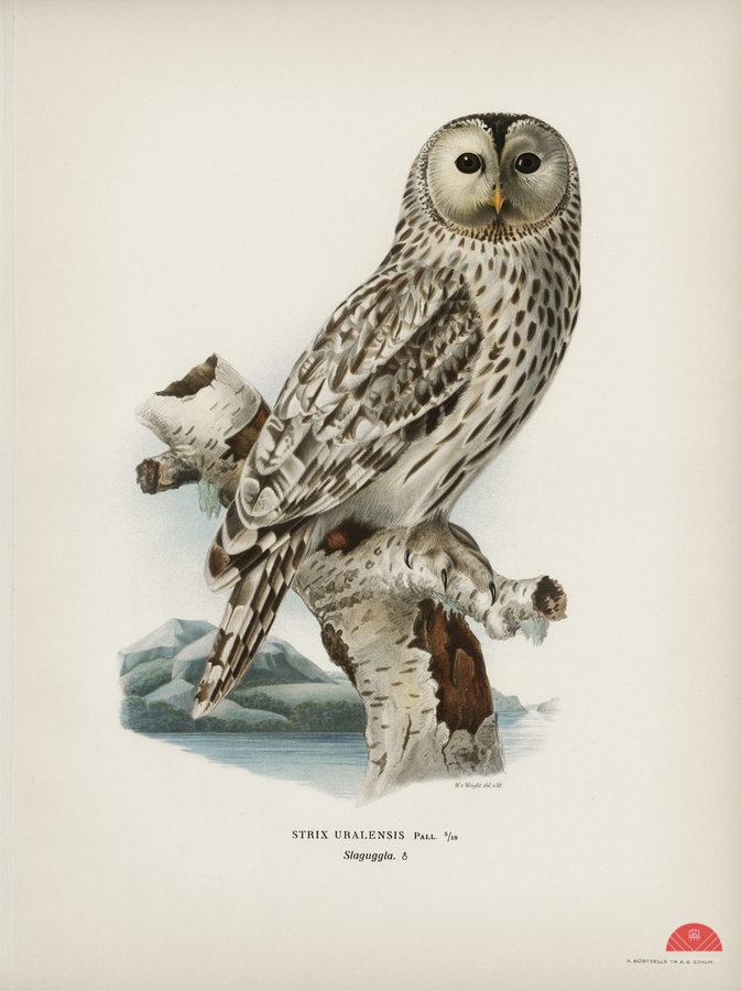 Strix uralensis ? illustrated by Magnus von Wright 1905-1968. from 1929 folio version of Svenska Fåglar Efter Naturen Och Pa Sten Ritade.