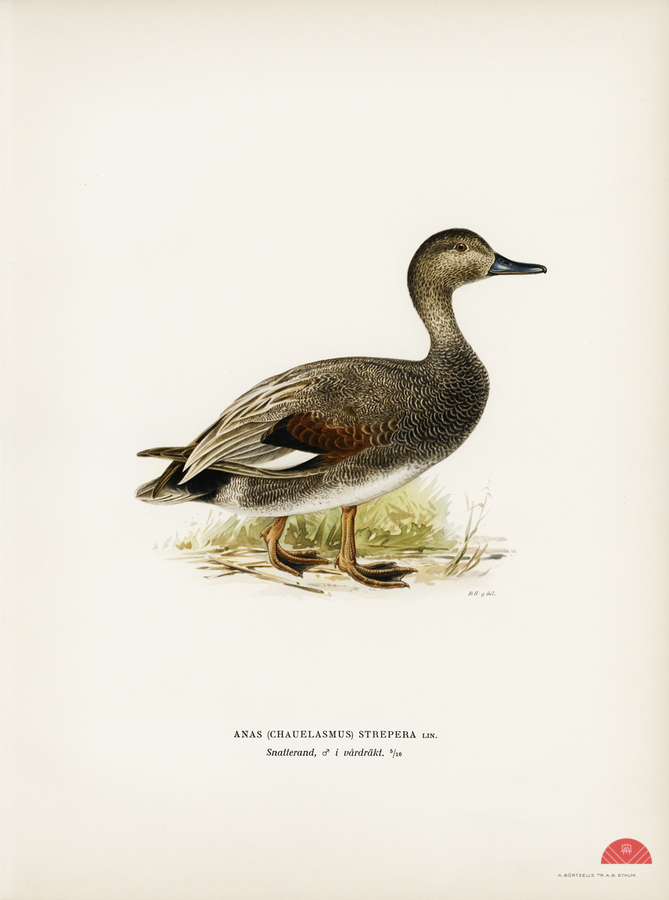 Gadwall Anas Chauelasmus Strepera illustrated by Magnus von Wright 1905-1968. from 1929 folio version of Svenska Fåglar Efter Naturen Och Pa Sten Ritade.