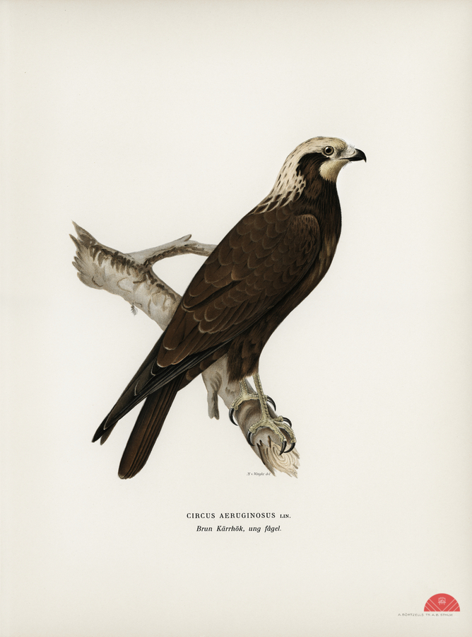 Marsh Harrier Circus aeruginosus illustrated by Magnus von Wright 1905-1968. from 1929 folio version of Svenska Fåglar Efter Naturen Och Pa Sten Ritade.
