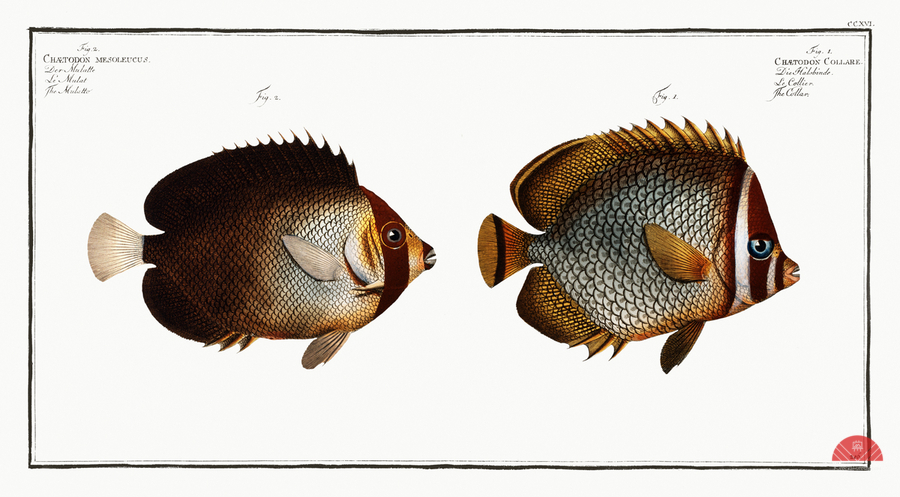 1. Collar Chaetodon Collare 2. Mulatto Chaetodon mesoleucus from Ichtylogie ou Histoire naturelle: génerale et particuliére des poissons 1785-1797 b...[+]