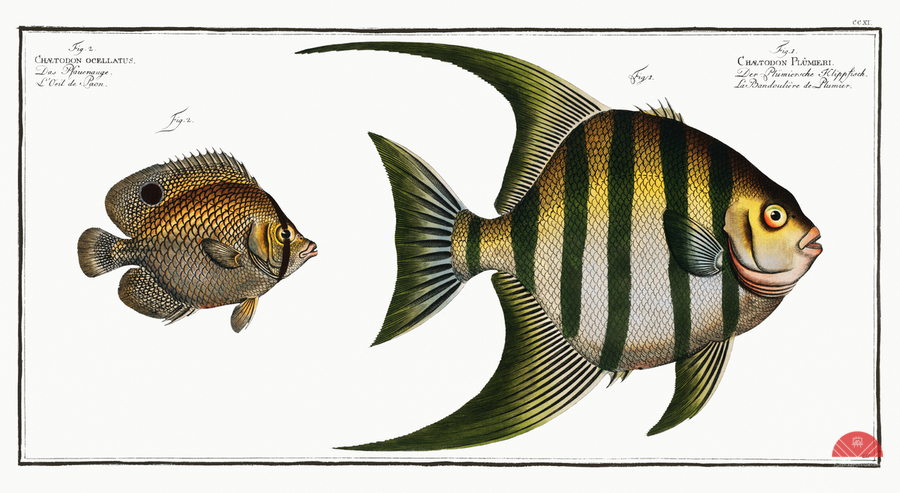1. Chaetodon Plümieri 2. Chaetodon ocellatus from Ichtylogie ou Histoire naturelle: génerale et particuliére des poissons 1785-1797 by Marcus Eliser 1723-1799