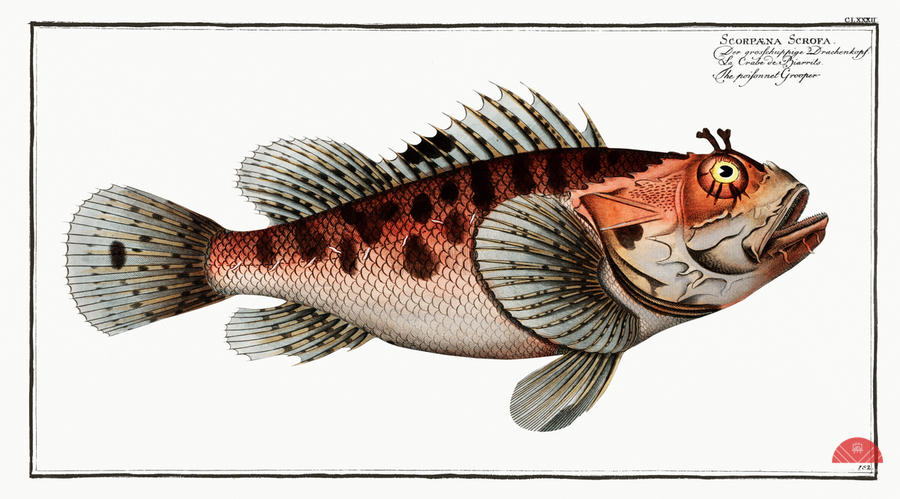 Poisonnet Grooper Scorpaena Scrofa from Ichtylogie ou Histoire naturelle: génerale et particuliére des poissons 1785-1797 by Marcus Eliser 1723-1799