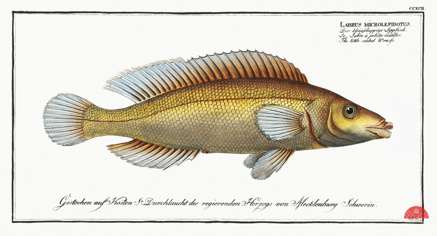 Little scaled Wrasse Labrus microlepidotus from Ichtylogie ou Histoire naturelle: génerale et particuliére des poissons 1785-1797 by Marcus Eliser 1723-1799