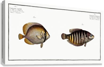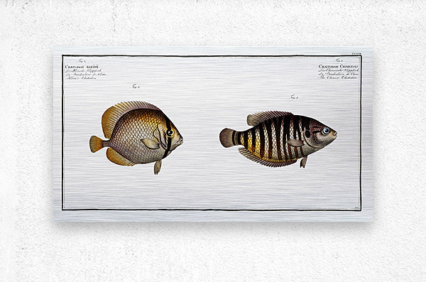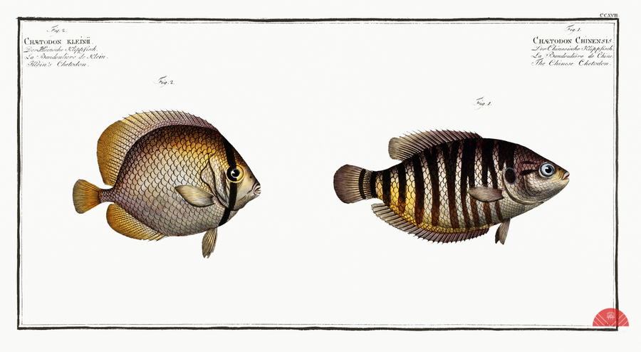 1. Chinese Chetodon Chaetodon Chinensis 2. Kleins Chetodon Chaetodon Kleinii from Ichtylogie ou Histoire naturelle: génerale et particuliére des poissons 1785-1797 by Marcus Eliser 1723-1799