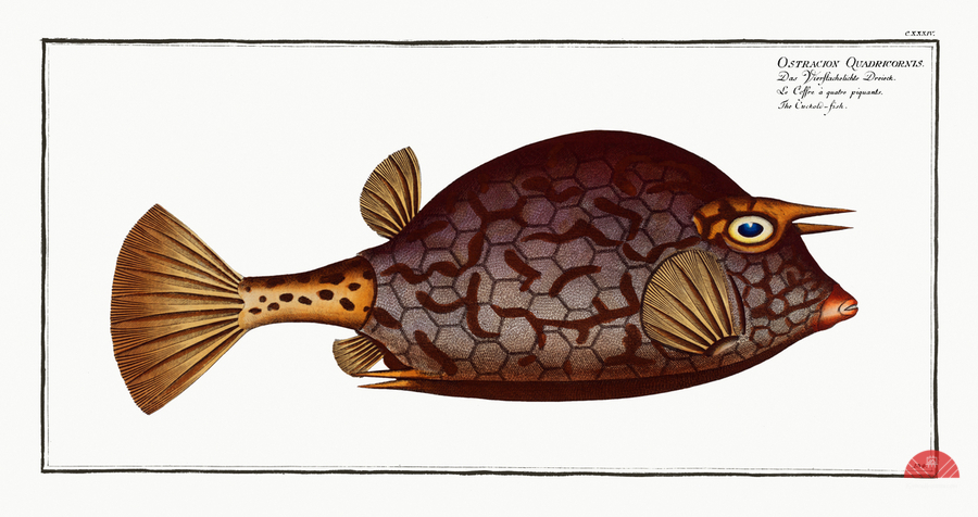 Cuckold-fish Ostracion Quadricornis from Ichtylogie ou Histoire naturelle: génerale et particuliére des poissons 1785-1797 by Marcus Eliser 1723-1799