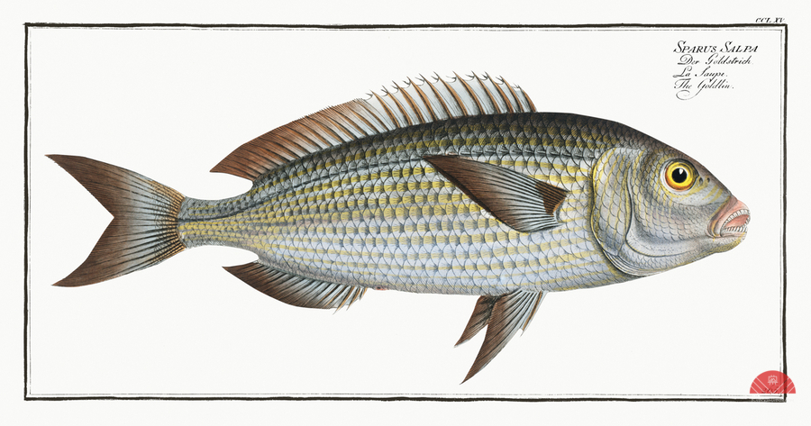 Goldlin Sparus Salpa from Ichtylogie ou Histoire naturelle: génerale et particuliére des poissons 1785-1797 by Marcus Eliser 1723-1799