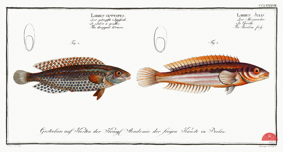 ABOUT THIS ARTWORK: 1. RAINBOW-FISH LABRUS JULIS 2. DROPPED WRASSE LABRUS GUTTATUS