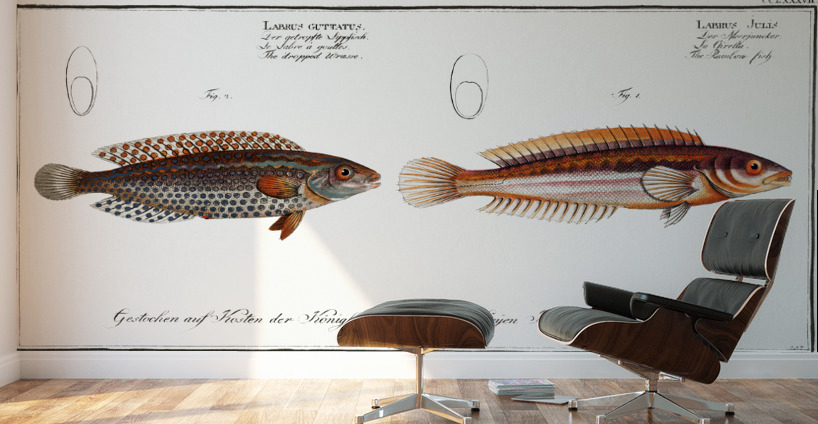 1. Rainbow-fish Labrus Julis 2. Dropped Wrasse Labrus Guttatus from Ichtylogie ou Histoire naturelle: génerale et particuliére des poissons 1785-179...[+]