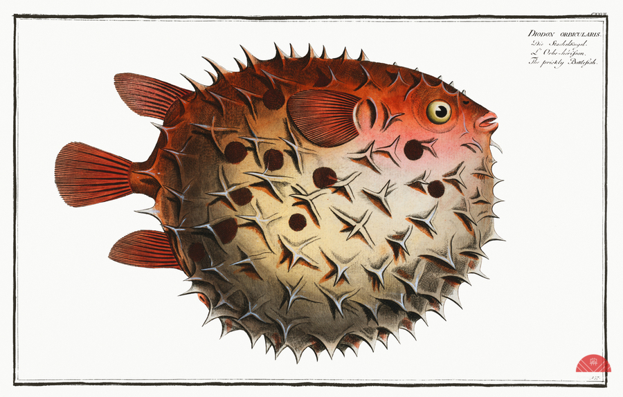Prickly Bottlefish Diodon orbicularis from Ichtylogie ou Histoire naturelle: génerale et particuliére des poissons 1785-1797 by Marcus Eliser 1723-1...[+]