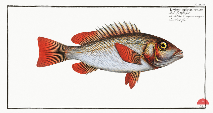 Red-fin Lutjanus erythropterus from Ichtylogie ou Histoire naturelle: génerale et particuliére des poissons 1785-1797 by Marcus Eliser 1723-1799