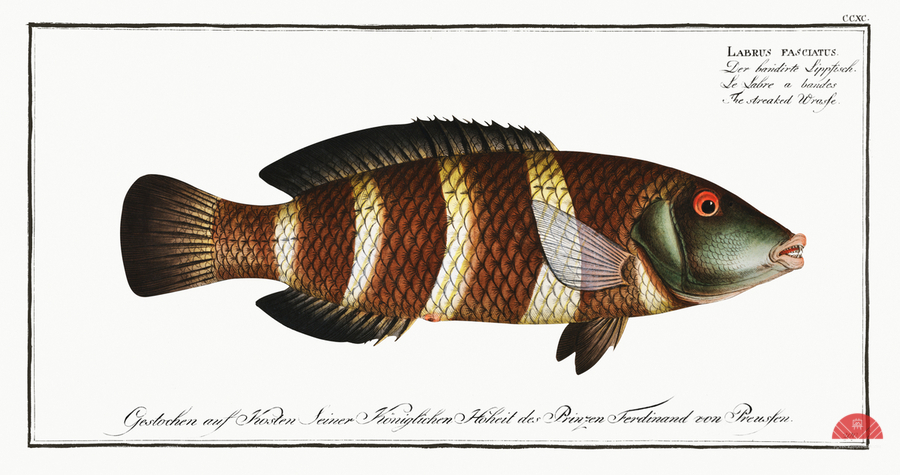 Streaked Wrasse Labrus fasciatus from Ichtylogie ou Histoire naturelle: génerale et particuliére des poissons 1785-1797 by Marcus Eliser 1723-1799