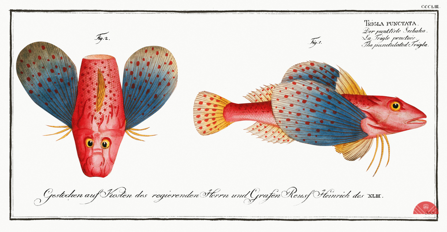 Punctulated Trigla Trigla punctata from Ichtylogie ou Histoire naturelle: génerale et particuliére des poissons 1785-1797 by Marcus Eliser 1723-1799