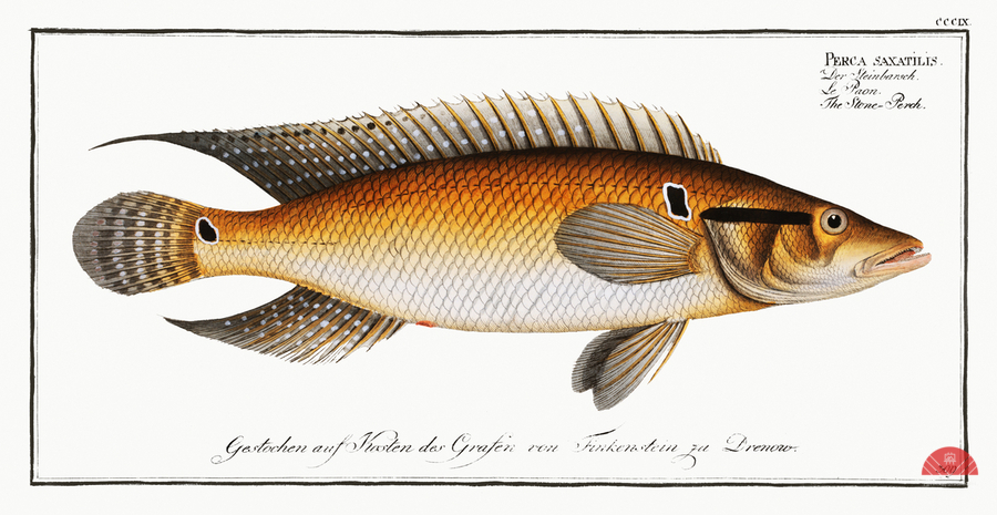 Stone-Perch Perca saxatilis from Ichtylogie ou Histoire naturelle: génerale et particuliére des poissons 1785-1797 by Marcus Eliser 1723-1799