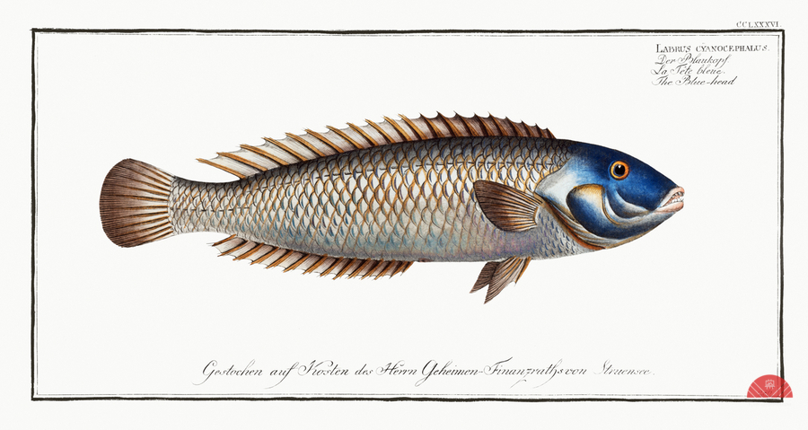 Blue-head Labrus cyanocephalus from Ichtylogie ou Histoire naturelle: génerale et particuliére des poissons 1785-1797 by Marcus Eliser 1723-1799