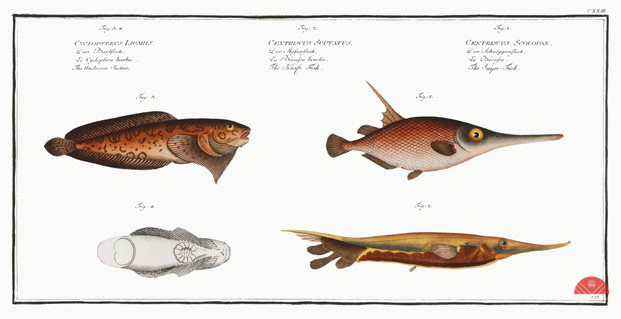ABOUT THIS ARTWORK: 1. SNIPE-FISH CENTRISCUS SCOLOPAX 2. KNIFE FISH CENTRISCUS SCUTATUS 3. 4. UNCTUOUS SUCKER CYCLOPTERUS LIPARIS