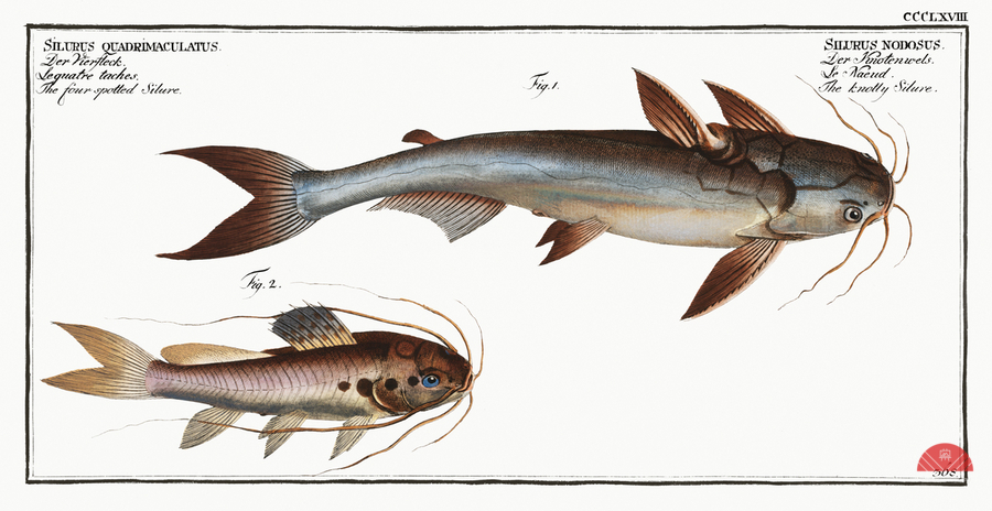 1. Knotty Silure Silurus Nodosus 2. Four spotted Silure Silurus Quadrimaculatus from Ichtylogie ou Histoire naturelle: génerale et particuliére des poissons 1785-1797 by Marcus Eliser 1723-1799