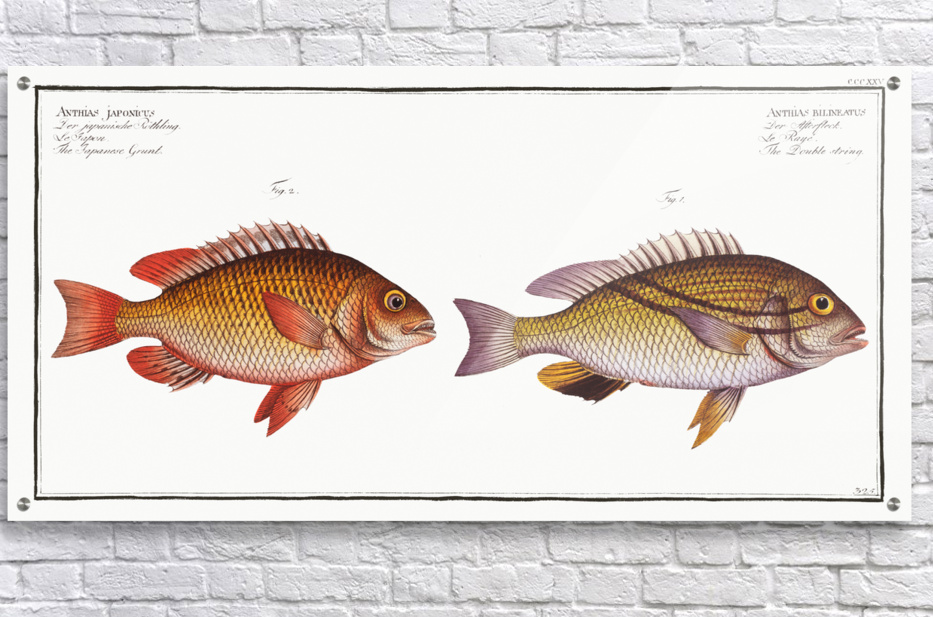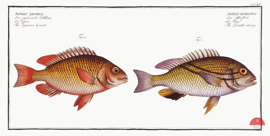 1. Double string Anthias bilineatus 2. Japanese Grunt Anthias japonicus from Ichtylogie ou Histoire naturelle: génerale et particuliére des poissons 1785-1797 by Marcus Eliser 1723-1799