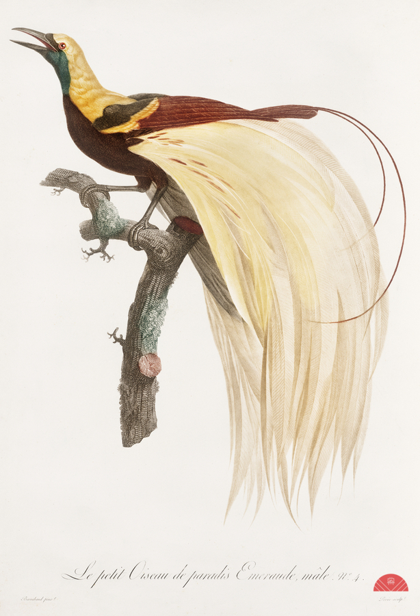 Young emperor bird-of-paradise male from Histoire Naturelle des Oiseaux de Paradis et Des Rolliers 1806 by Jacques Barraband 1767-1809.