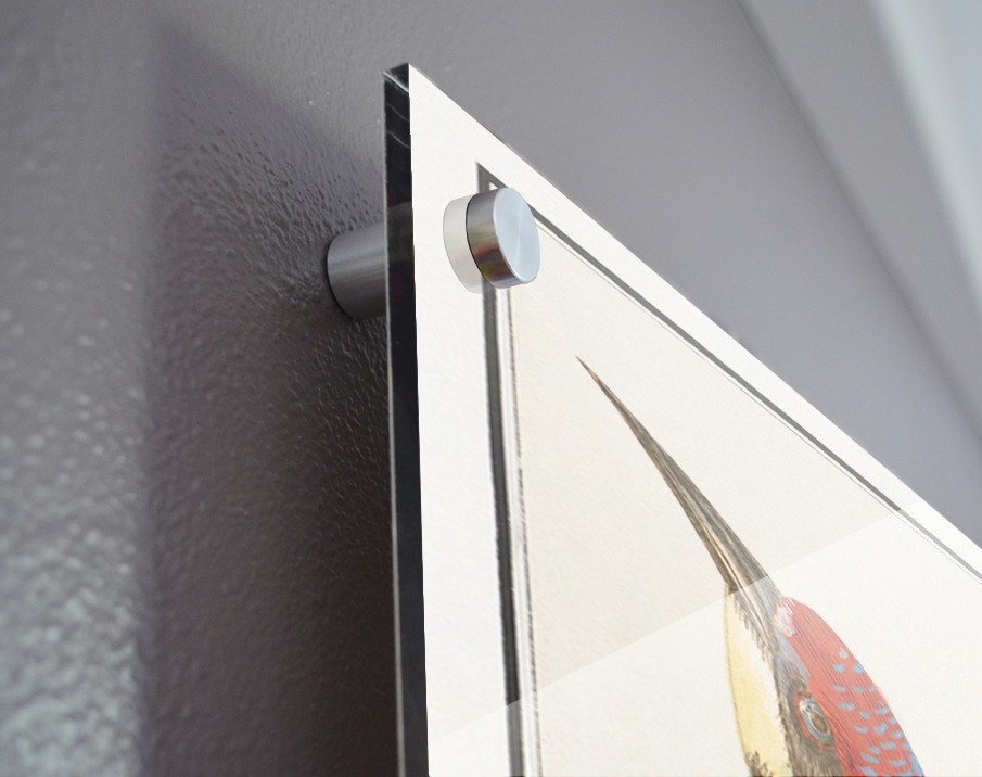 Printed to the edge - Ready to hang - provided with 4 premium polished aluminum stand off ( wall screws and mounting hardware provided ) We suggest a thicker 3/16" acrylic for any size over 42 inches to guarantee a straight acrylic, without curvature