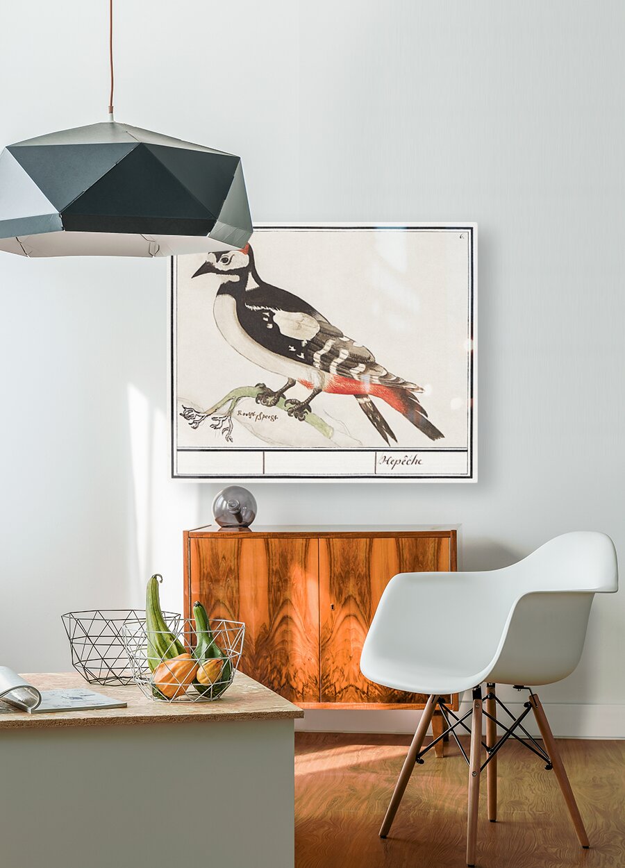 Get this artwork "Great spotted woodpecker in vintage style" in a framed print.