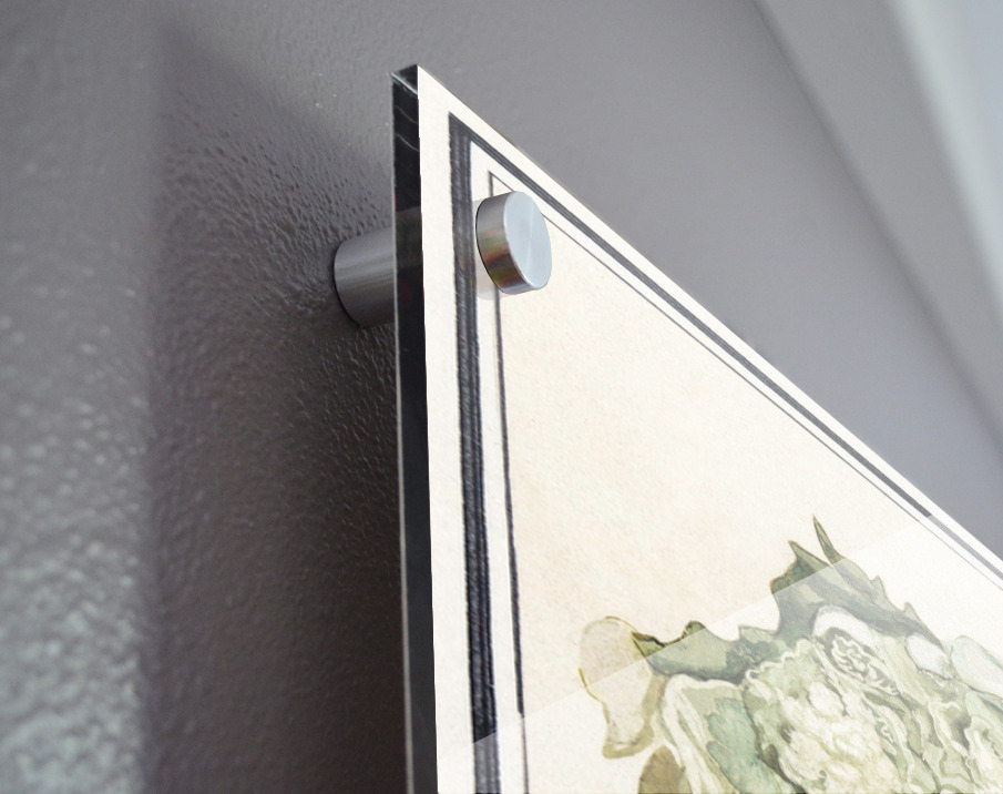 Printed to the edge - Ready to hang - provided with 4 premium polished aluminum stand off ( wall screws and mounting hardware provided ) We suggest a thicker 3/16" acrylic for any size over 42 inches to guarantee a straight acrylic, without curvature