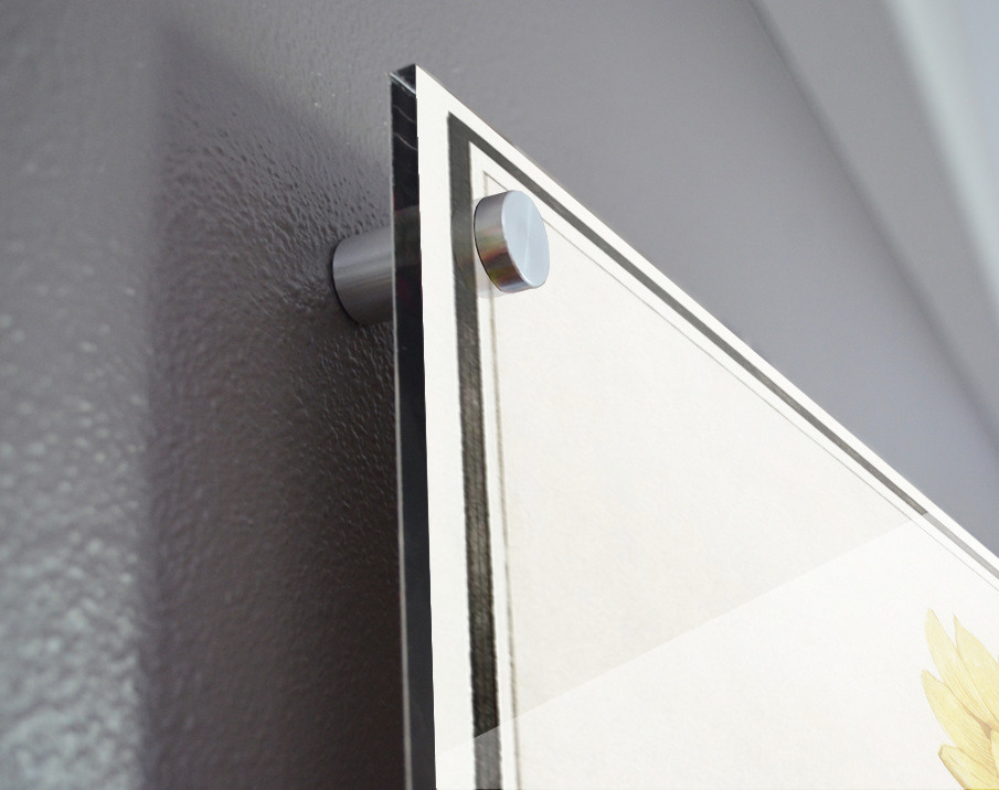 Printed to the edge - Ready to hang - provided with 4 premium polished aluminum stand off ( wall screws and mounting hardware provided ) We suggest a thicker 3/16" acrylic for any size over 42 inches to guarantee a straight acrylic, without curvature