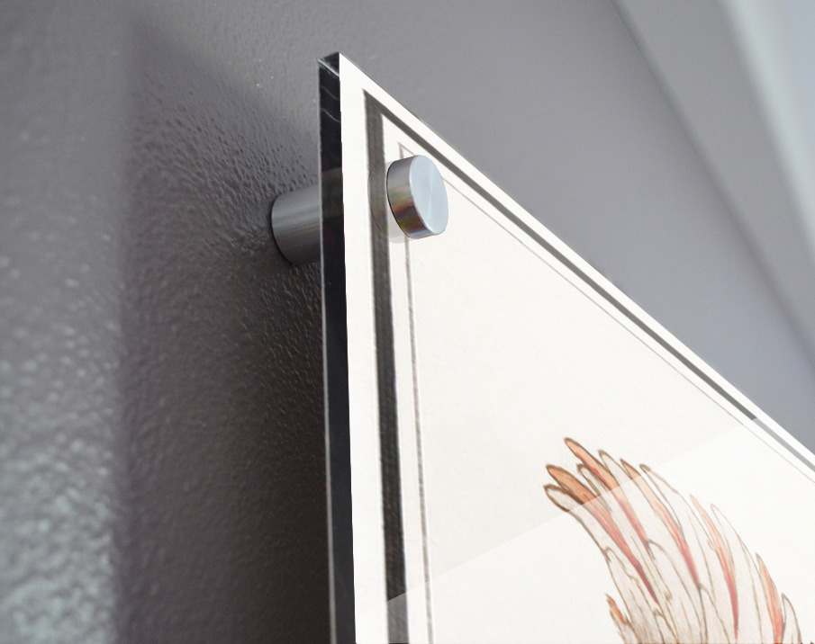 Printed to the edge - Ready to hang - provided with 4 premium polished aluminum stand off ( wall screws and mounting hardware provided ) We suggest a thicker 3/16" acrylic for any size over 42 inches to guarantee a straight acrylic, without curvature