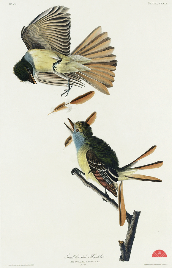 Great Crested Flycatcher from Birds of America 1827 by John James Audubon 1785 - 1851 etched by Robert Havell 1793 - 1878.