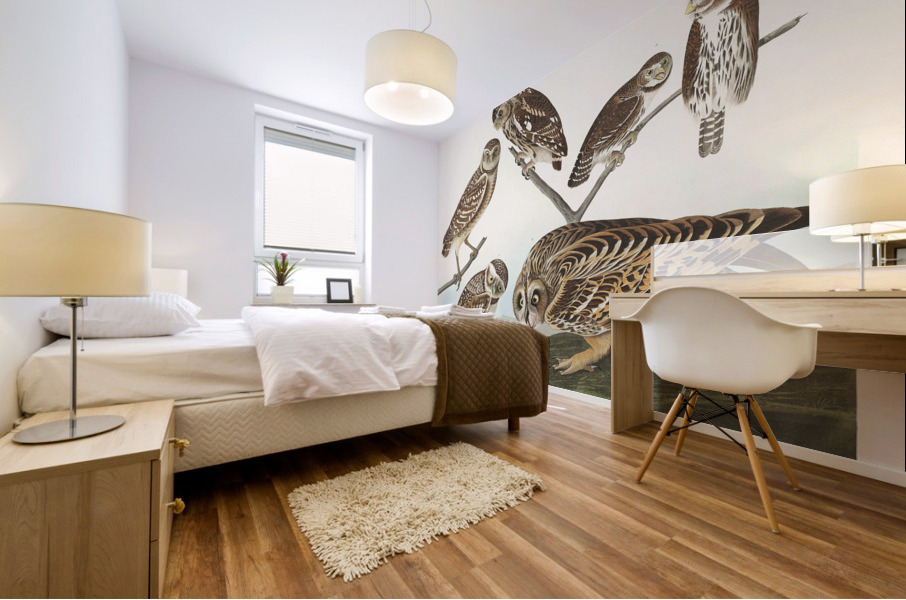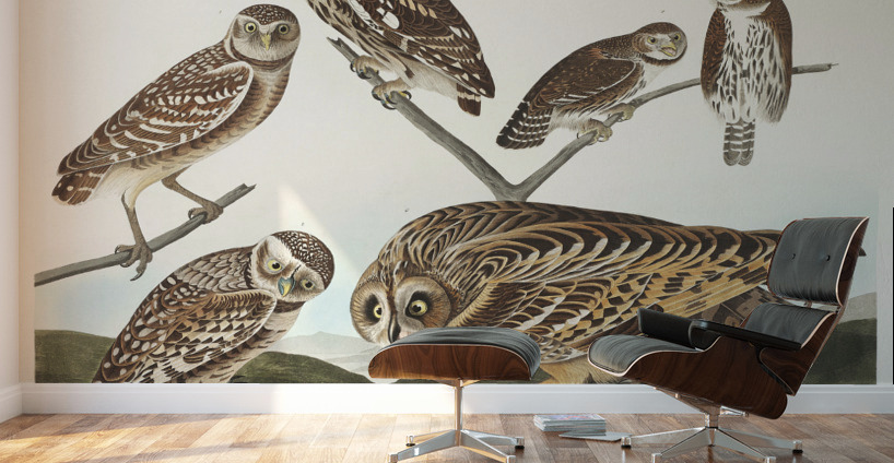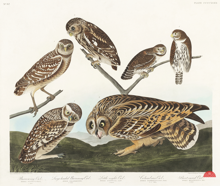 Burrowing Owl Large-Headed Burrowing Owl Little Night Owl Columbian Owl and Short-cared Owl from Birds of America 1827 by John James Audubon 1785 - 18...[+]