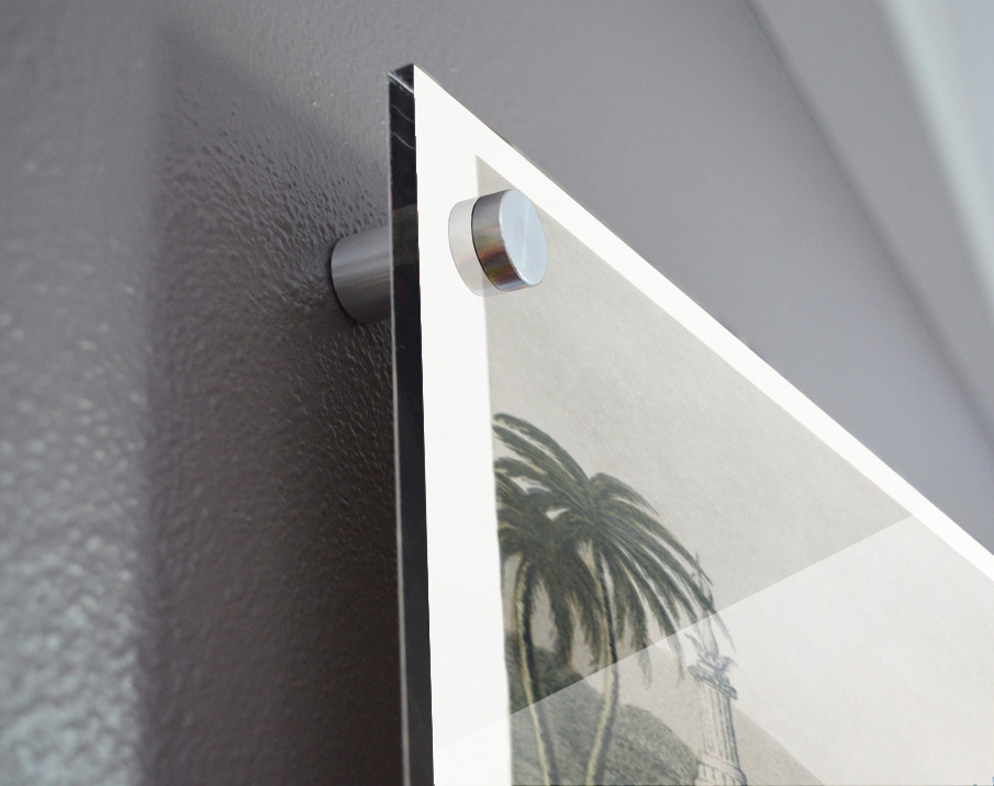 Printed to the edge - Ready to hang - provided with 4 premium polished aluminum stand off ( wall screws and mounting hardware provided ) We suggest a thicker 3/16" acrylic for any size over 42 inches to guarantee a straight acrylic, without curvature