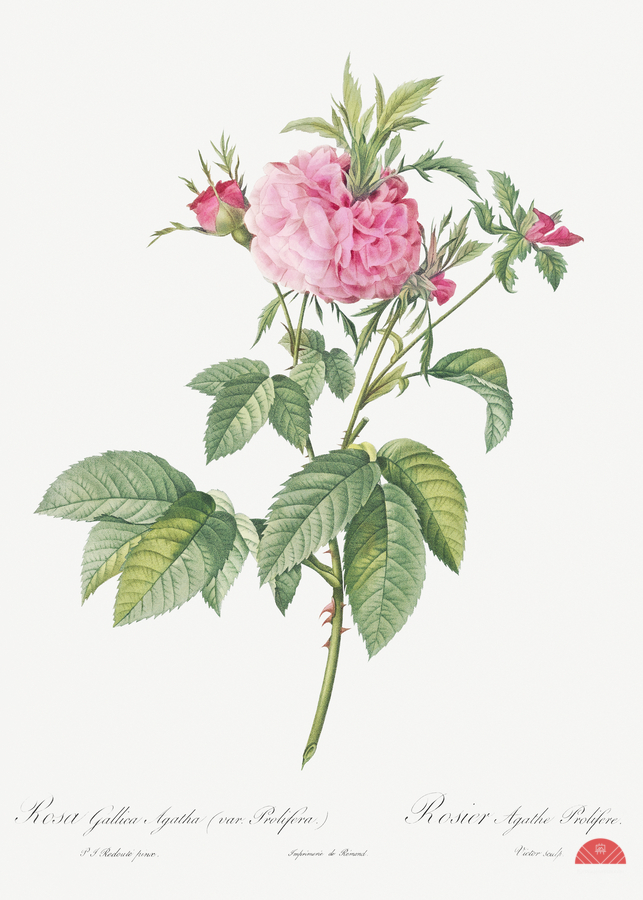 Agatha rose also known as Rosa gallica-Agatha Var. Prolifera from Les Roses 1817–1824 by Pierre-Joseph Redouté.