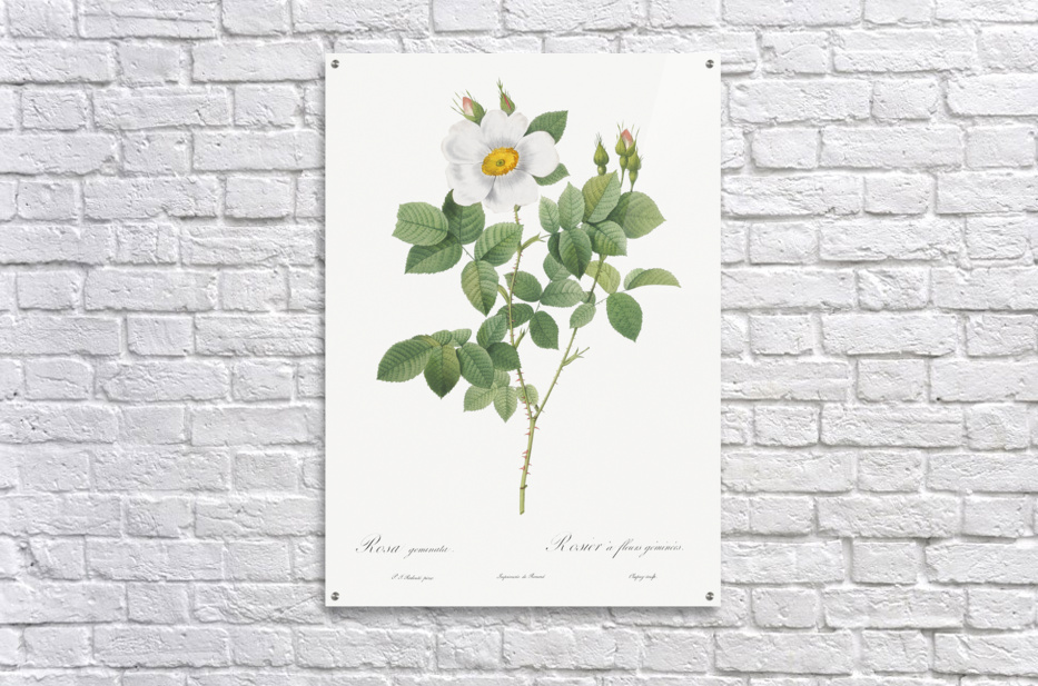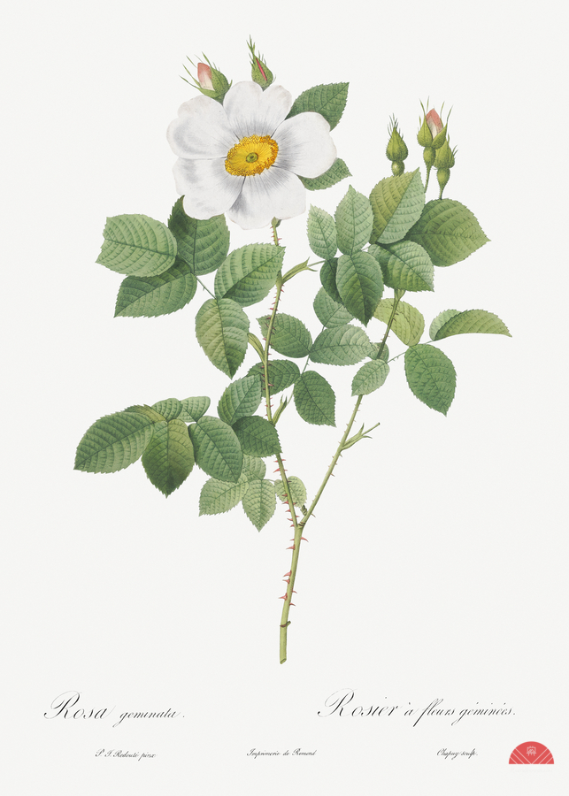 Twin-Flowered White Rose also known as Rosebush with Geminate Flowers Rosa geminata from Les Roses 1817–1824 by Pierre-Joseph Redouté.