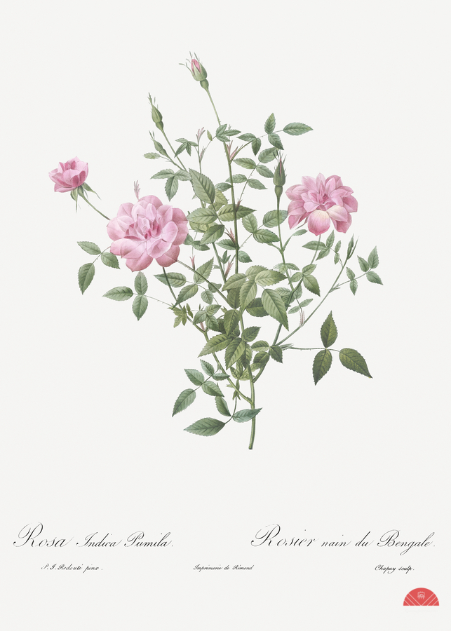 Double Miniature Rose also known as Dwarf Rosebush Rosa indica pumila from Les Roses 1817–1824 by Pierre-Joseph Redouté.