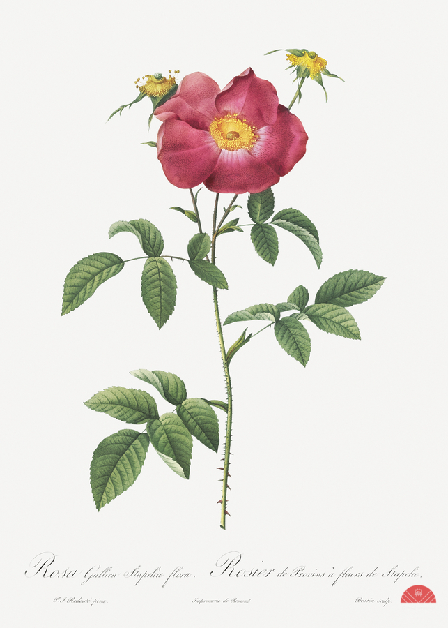 Stapelia French rose variety Rosa gallica stapelice flora from Les Roses 1817–1824 by Pierre-Joseph Redouté.