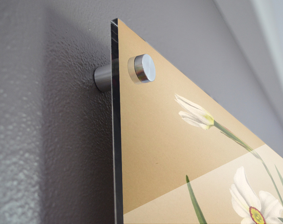 Printed to the edge - Ready to hang - provided with 4 premium polished aluminum stand off ( wall screws and mounting hardware provided ) We suggest a thicker 3/16" acrylic for any size over 42 inches to guarantee a straight acrylic, without curvature