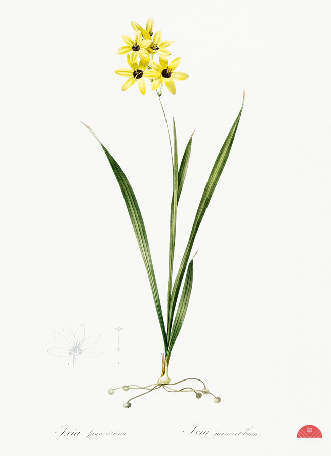 Ixia fusco citrina illustration from Les liliacées 1805 by Pierre Joseph Redouté 1759-1840.