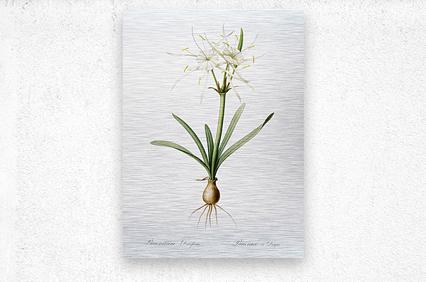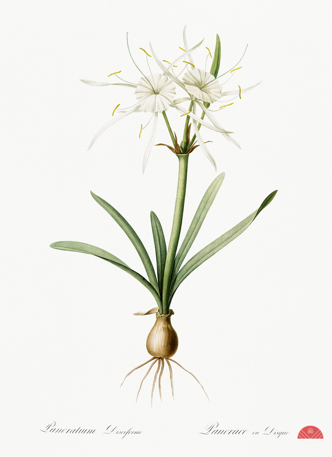 Streambank spiderlily Pancratium disciforme illustration from Les liliacées 1805 by Pierre Joseph Redouté 1759-1840.