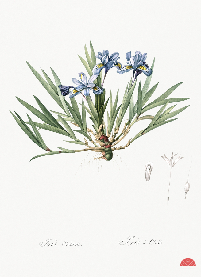 Dwarf crested iris illustration from Les liliacées 1805 by Pierre Joseph Redouté 1759-1840.
