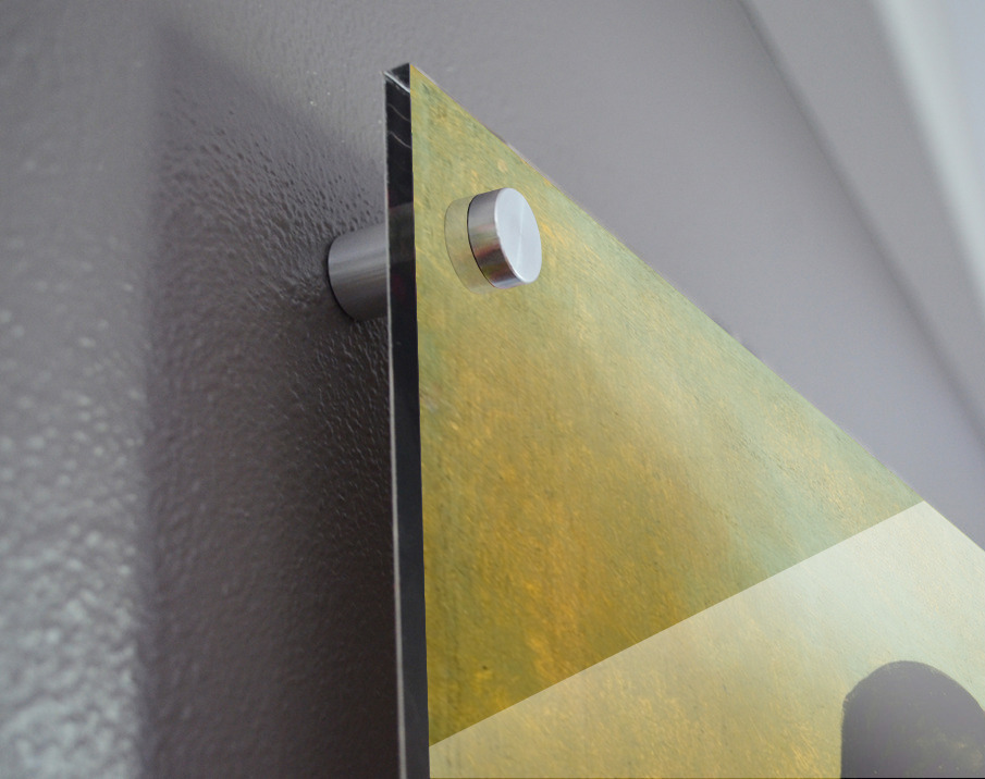 Printed to the edge - Ready to hang - provided with 4 premium polished aluminum stand off ( wall screws and mounting hardware provided ) We suggest a thicker 3/16" acrylic for any size over 42 inches to guarantee a straight acrylic, without curvature