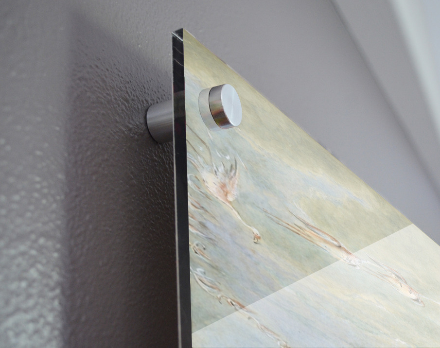 Printed to the edge - Ready to hang - provided with 4 premium polished aluminum stand off ( wall screws and mounting hardware provided ) We suggest a thicker 3/16" acrylic for any size over 42 inches to guarantee a straight acrylic, without curvature