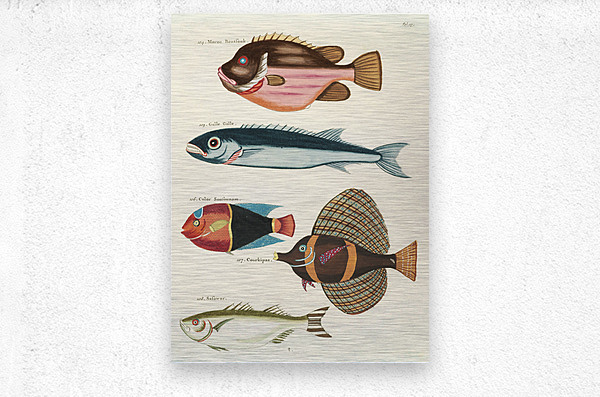 ABOUT THIS ARTWORK: COLOURFUL AND SURREAL ILLUSTRATIONS OF FISHES FOUND IN MOLUCCAS INDONESIA AND THE EAST INDIES BY LOUIS RENARD 1678 -1746 FROM HISTOIRE NATURELLE DES PLUS RARES CURIOSITEZ DE LA MER DES INDES 1754.