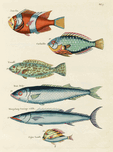 COLOURFUL AND SURREAL ILLUSTRATIONS OF FISHES FOUND IN MOLUCCAS INDONESIA AND THE EAST INDIES BY LOUIS RENARD 1678 -1746 FROM HISTOIRE NATURELLE DES PLUS RARES CURIOSITEZ DE LA MER DES INDES 1754.