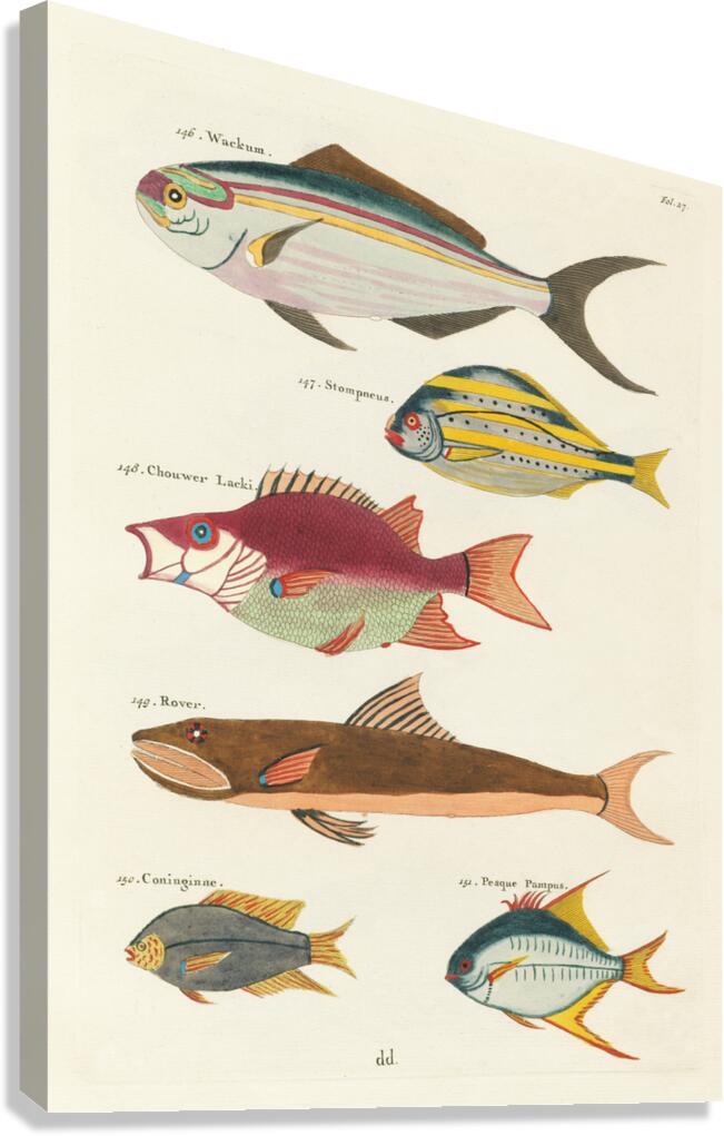 Colourful and surreal illustrations of fishes found in Moluccas Indonesia and the East Indies by Louis Renard 1678 -1746 from Histoire naturelle des plus rares curiositez de la mer des Indes 1754. Canvas print