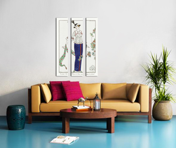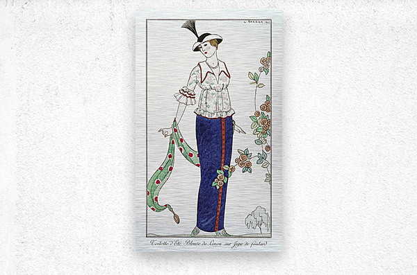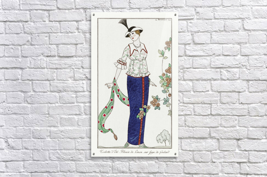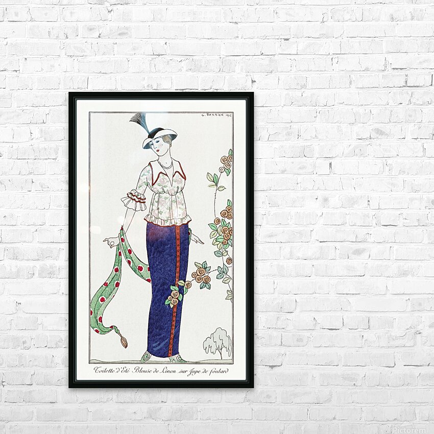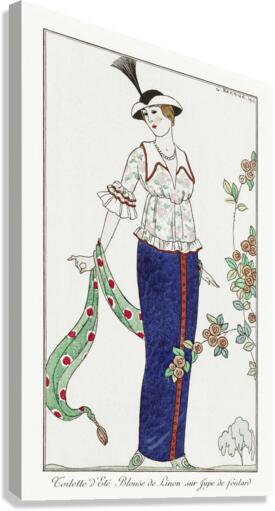 Get this artwork "Costumes Parisiens no. 3: Toilette dÉté Toilette dÉté Blouson de Linon sur Jupe de foulard from Journal des Dames et des Modes 1912 fashion illustration by George Barbier. " in a framed print.