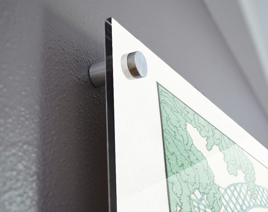 Printed to the edge - Ready to hang - provided with 4 premium polished aluminum stand off ( wall screws and mounting hardware provided ) We suggest a thicker 3/16" acrylic for any size over 42 inches to guarantee a straight acrylic, without curvature