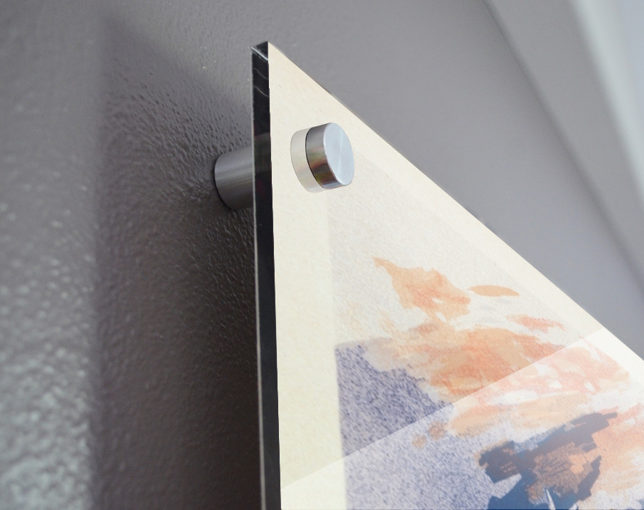 Printed to the edge - Ready to hang - provided with 4 premium polished aluminum stand off ( wall screws and mounting hardware provided ) We suggest a thicker 3/16" acrylic for any size over 42 inches to guarantee a straight acrylic, without curvature